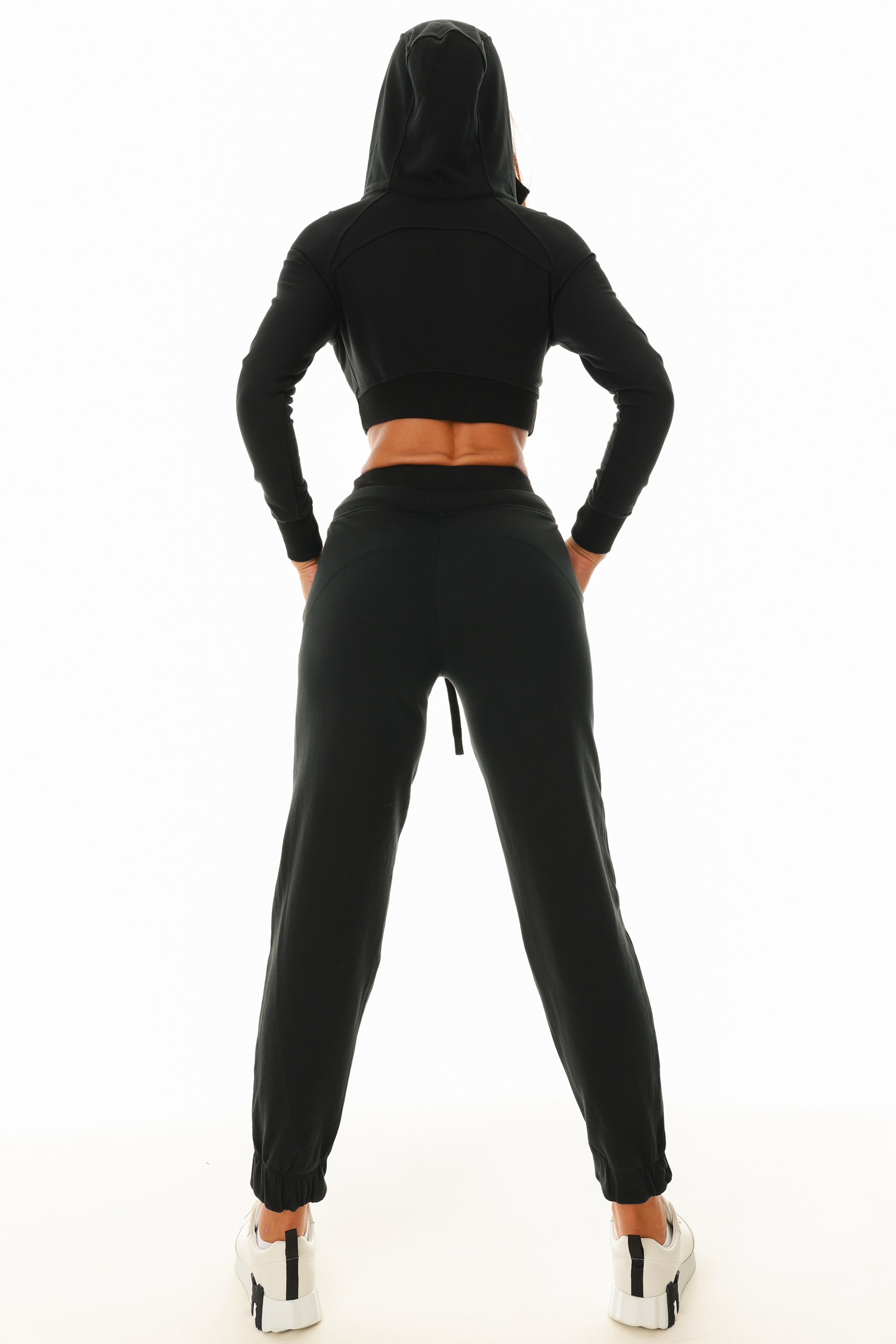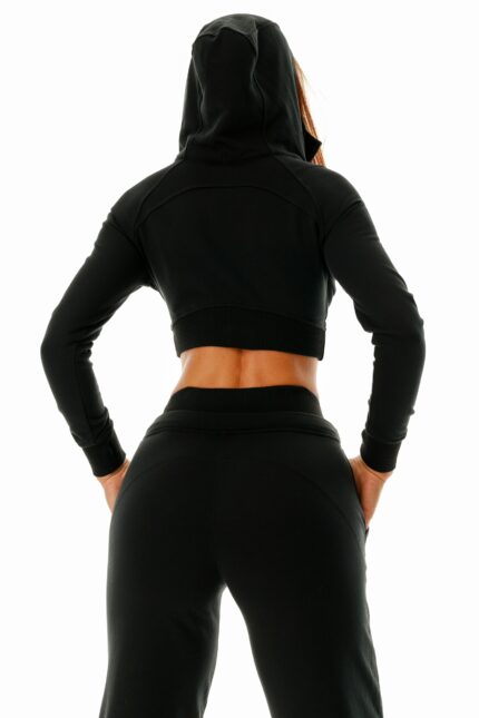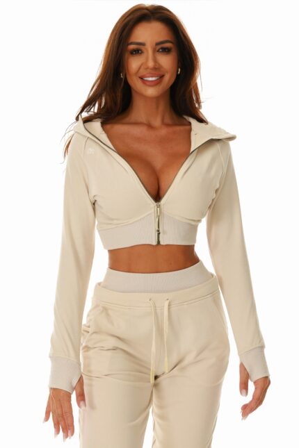 Design modern , banda elastica la talie pentru conturare. Bluza slim accesorizata cu fermoar si gluga .